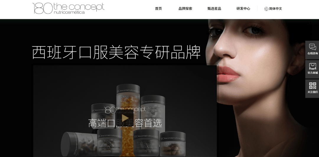 品牌官网及宣传材料显示,概念180自称“源自西班牙的高端口服抗衰品牌,拥有超过30年科研与市场积淀”,独创“六维营养定位体系”,宣称能“以科学视角精准解析衰老根源,融合美学与营养提供全面抗衰解决方案”。
