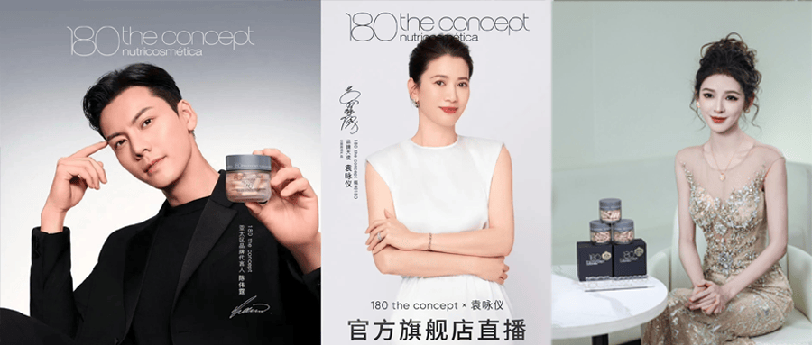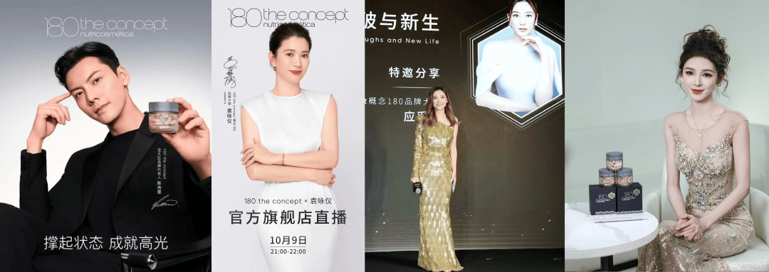 概念180(180 the concept)的市场走红,离不开明星网红的强力背书。公开信息显示,青年演员张予曦曾以“品牌挚友”身份出席其新品发布会,分享所谓“骨相抗衰”体验;2023年该品牌官宣应采儿为品牌大使,2024年携手袁咏仪合作,2025年进一步签约陈伟霆担任首位亚太区品牌大使。
