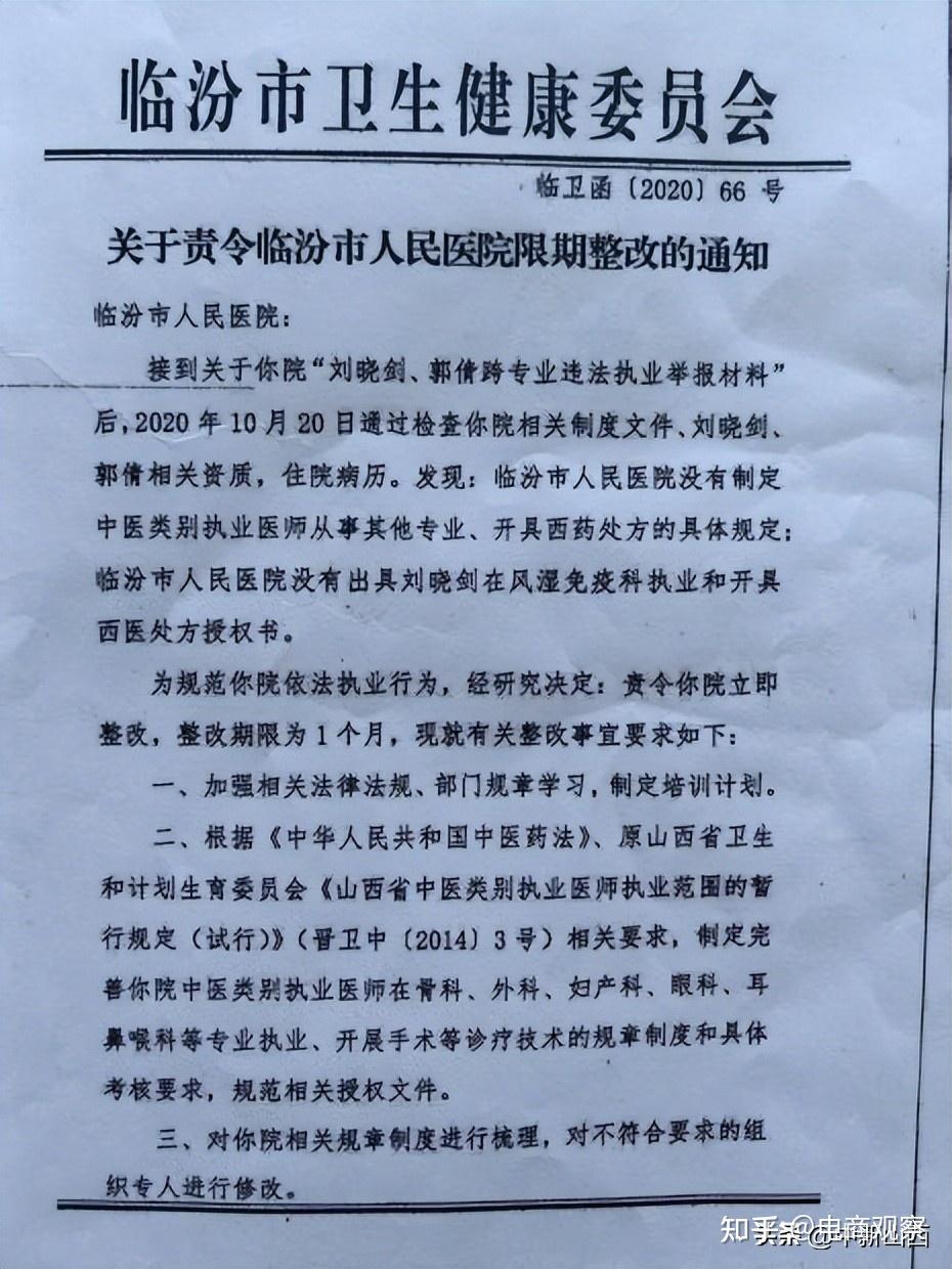 记者在网上查询到,此前法制日报在2025年12月17日的报道中提到,2019年9月19日至2025年10月1日期间,刘晓剑以注册的中医专业资质,长期在西医范畴的风湿免疫科等门诊跨专业执业,累计接诊患者约5809人次,同时为他人在肛肠外科、中医科开展诊疗提供便利。调查发现,针对刘晓剑跨专业执业问题,临汾市卫健委早在2020年10月就已接到举报并作出处理。编号为“临卫函〔2020〕66号”的《关于责令临汾市人民医院限期整改的通知》显示,经核查医院制度文件、刘晓剑及郭某资质与住院病历,发现医院未制定中医类别医师从事其他专业、开具西药处方的具体规定,也未向刘晓剑出具风湿免疫科执业及开具西药处方的授权书。临汾卫健委据此责令医院限期一个月整改。