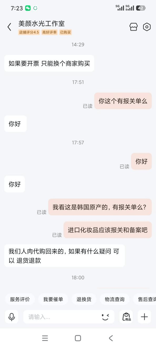 根据包装可以看出,该产品原产于韩国,属于跨境电商,开票属于合理要求,如果连发票都没有,王先生怀疑该产品为走私产品。随即,王先生要求商家提供该产品海关的报关单以及国家药品监督管理局(NMPA)备案信息。但商家的回复让其大吃一惊:“我们人肉代购回来的,如果有什么疑问,可以退货退款。”