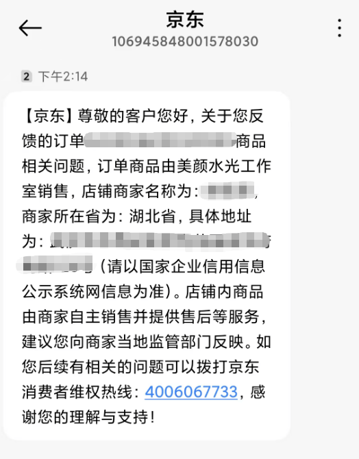 一天后,王先生发现并无京东售后专员介入,且涉事商品仍处于在售状态。之后,王先生拨打了京东所在地的12345热线,等来的却是一条短信,京东将平台责任推卸给了商家注册地址的监管部门。王先生发现,这家店铺是个人用身份证开通的,即使投诉人找到当地监管部门,而如何找个人为主体的京东商户维权,也是一个难题。