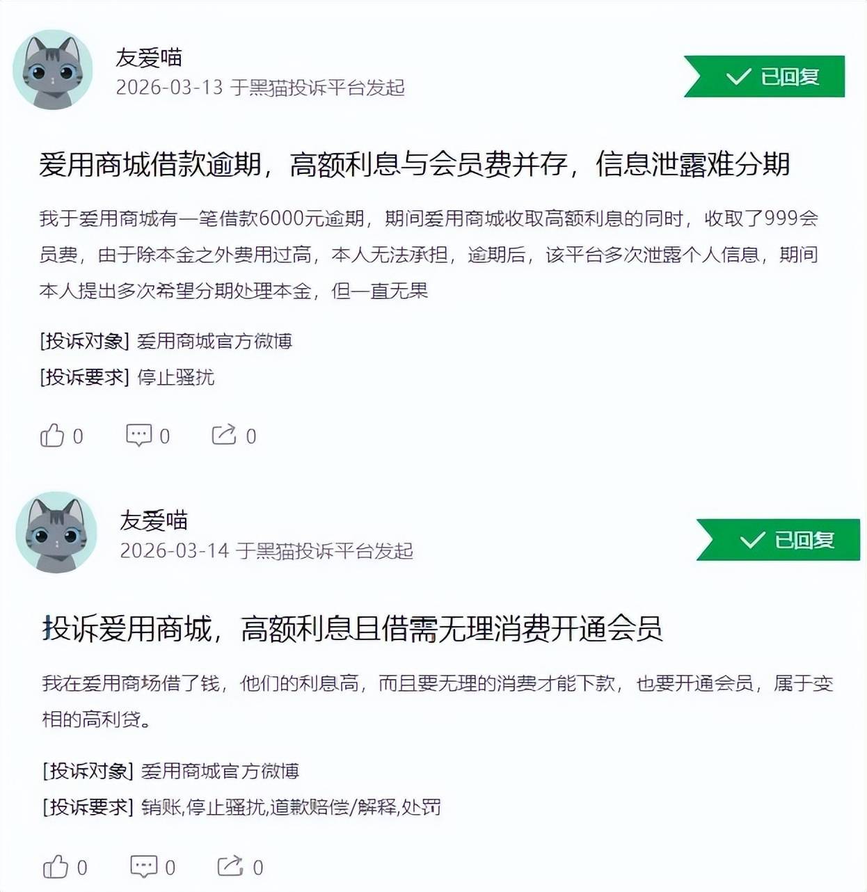 一消费者称,自己在爱用商城借款6000元,爱用商城除了收取高额利息费,还收取了999元的会员费。在该贷款逾期后,平台多次泄露个人信息,用户协商分期还款,未得到同意。另一用户也表示自己在爱用商城借款,需要先开通会员才能下款。