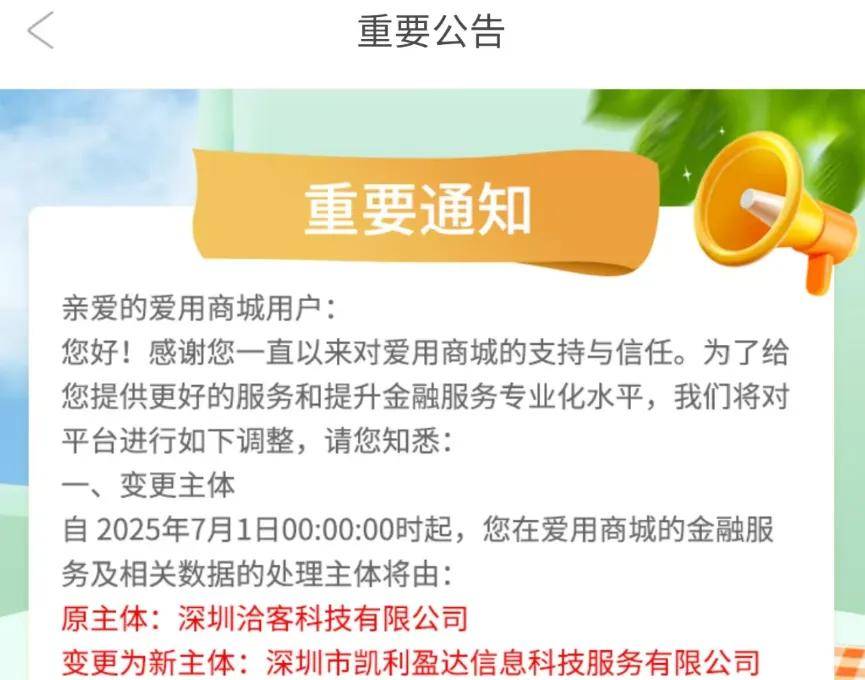 除了这一层关系,公开信息显示,爱用商城金融服务及相关数据的处理主体曾在2025年7月,从洽客科技变更为凯利盈达信息科技,爱用商城的借款页面也变成了“凯利金”。