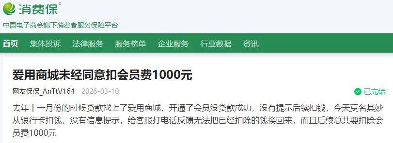 更有甚者,3月10日一用户在消费保平台投诉称,自己在2025年11月想通过爱用商城贷款,开通了会员却没有贷款成功。几个月后莫名收到银行卡扣款,才得知即使贷款不成功,也会扣取1000元会员费。