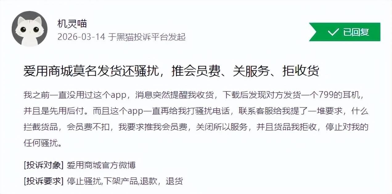 如3月14日,一用户投诉称,自己并未用过爱用商城APP,却收到消息提醒其收货,下载后发现平台为其发货了一个799元的耳机,且是先用后付。该用户随即联系平台客服处理,客服只要求其拦截商品,并不退还会员费。