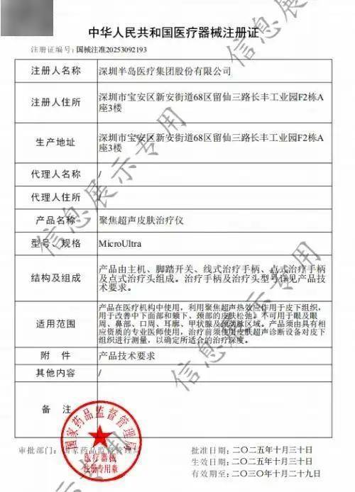 直至2025年10月底,半岛医疗的“半岛大超炮”(聚焦超声皮肤治疗仪,国械注准20253092193)正式获得国家药品监督管理局颁发的第三类医疗器械注册证,成为国内首个获得“三类证”的超声医美器械。