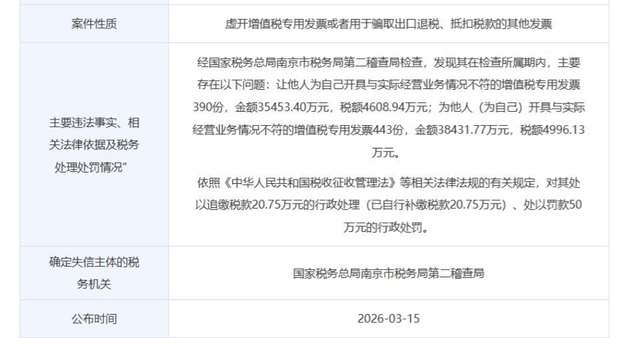 经查,南京三宝数码双向虚开增值税专用发票。其中,让他人为自己虚开 390 份,金额 3.54 亿元、税额 4608.94 万元;为他人虚开 443 份,金额 3.84 亿元、税额 4996.13 万元,合计涉案金额超 7 亿元。税务部门对其追缴税款 20.75 万元(已补缴),并处 50 万元罚款。