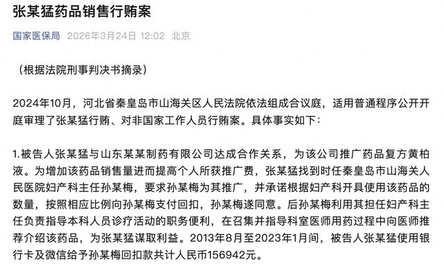 3月24日,国家医保局通报了“张某猛药品销售行贿案”。为了推广药品复方黄柏液,2013年至2023年,山东某某制药有限公司推广员张某猛给予秦皇岛市多名医务人员回扣款和统方好处费共计36.5万元。