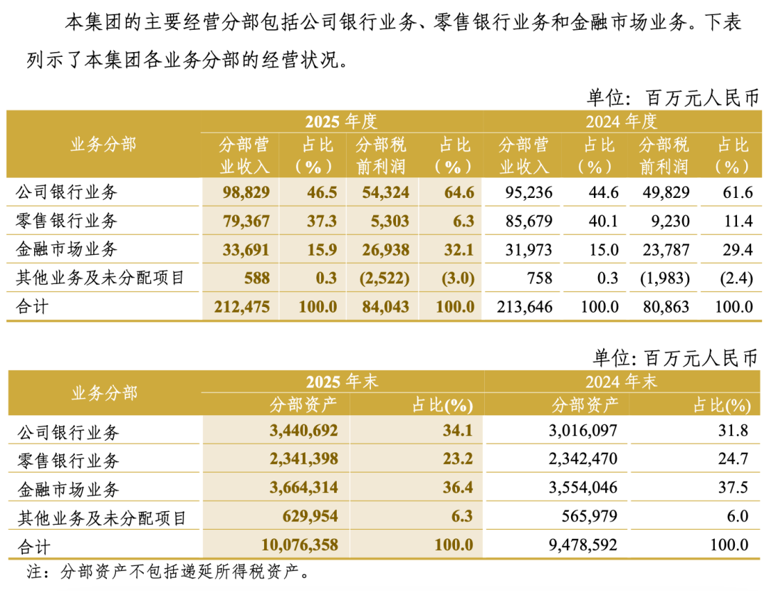 根据年报披露,2025年,中信银行零售银行平均总资产4.68万亿元「(2024年期末资产+2025年期末资产)÷2」。据此计算,零售银行总资产报酬率(ROA)为 0.23%。同期,公司银行业务的总资产报酬率为,金融市场业务的ROA分别为1.68%、0.75%。显然,中信银行零售银行业务的赚钱能力更弱。