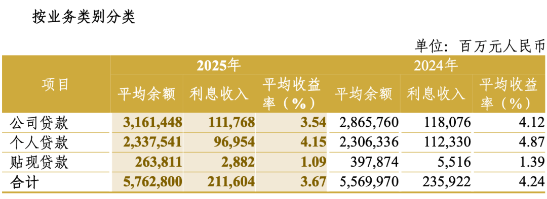 虽然零售银行业务赚钱更弱,但个人贷款业务的平均收益率却更高。根据年报披露,2025年,中信银行公司贷款的平均收益率为3.54%,上年平均收益率为4.12%;个人贷款平均收益率4.15%,上年平均收益率为4.87%;贴现贷款平均收益率为1.09%,上年平均收益率为1.39%。不难发现,虽然中信银行贷款业务的平均收益率都在下降,但个人贷款业务的平均收益率依然最高。
