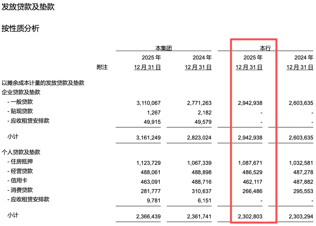 根据年报披露,截至2025年末,中信银行个人贷款及垫款余额23028.03亿元。其中,住房抵押贷款10876.71亿元(占比47.23%)、经营贷款4865.29亿元(占比21.13%)、信用卡4621.17亿元(占比20.07%)、消费贷款2664.86亿元(占比11.57%)。