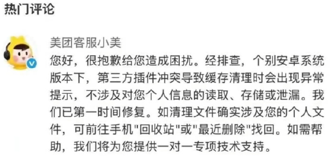事件发酵后,美团客服第一时间在评论区做出回应。其表示:“很抱歉给您造成困扰。经排查,个别安卓系统版本下,第三方插件冲突导致缓存清理时会出现异常提示,不涉及对您个人信息的读取、存储或泄漏。我们已第一时间修复。如清理文件确实涉及您的个人文件,可前往手机回收站或‘最近删除’找回。如需帮助,我们将为您提供一对一专项技术支持。”