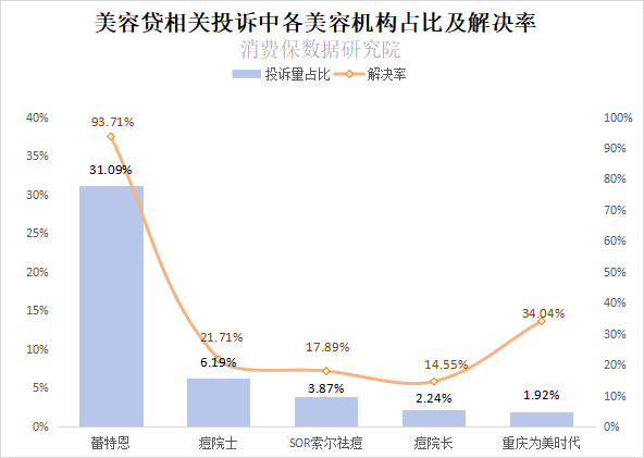 在消费保平台美容贷相关投诉里,蕾特恩投诉占比最高,达31.09%;第二、第三为痘院士(6.19%)、SOR索尔祛痘(3.87%)。