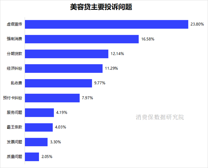 据消费保平台数据显示,美容贷主要投诉问题呈现集中化特征,虚假宣传以23.80%的占比位居首位,强制消费(16.58%)、分期贷款(12.14%)、经济纠纷(11.29%)紧随其后。