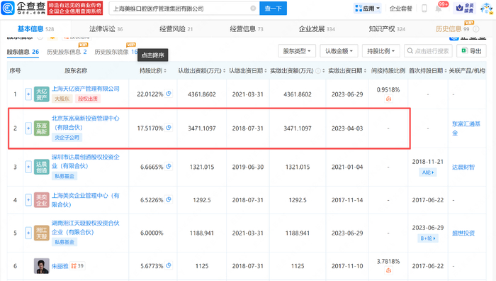 圆维度通过企查查进一步穿透股权结构发现,上海美维口腔医疗管理集团有限公司隶属于美年健康集团。该公司股东之一北京东富高新投资管理中心(有限合伙)为中国东方资产管理股份有限公司的子公司,可视为具有央企背景。但该主体持股层级为集团层面,并未直接入股北京维乐口腔。