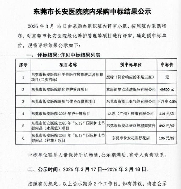 近日,有网友发文称,广东省东莞市长安医院在官方网站发布了《东莞市长安医院院内招标(20260305\09)中标结果公示》中,第5项2026年“5.12”国际护士节慰问品水果篮项目中标价格为492元/份、第6项2026年“5.12”国际护士节慰问品鲜花项目中标价为196元/份,认为这两个项目的中标价格高于市场价,对此提出质疑。