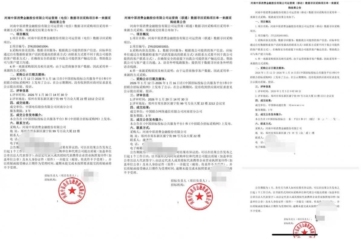 中原消费金融发布的“运营商数据寻回采购项目”单一来源采购结果公告。(来源:企查查)