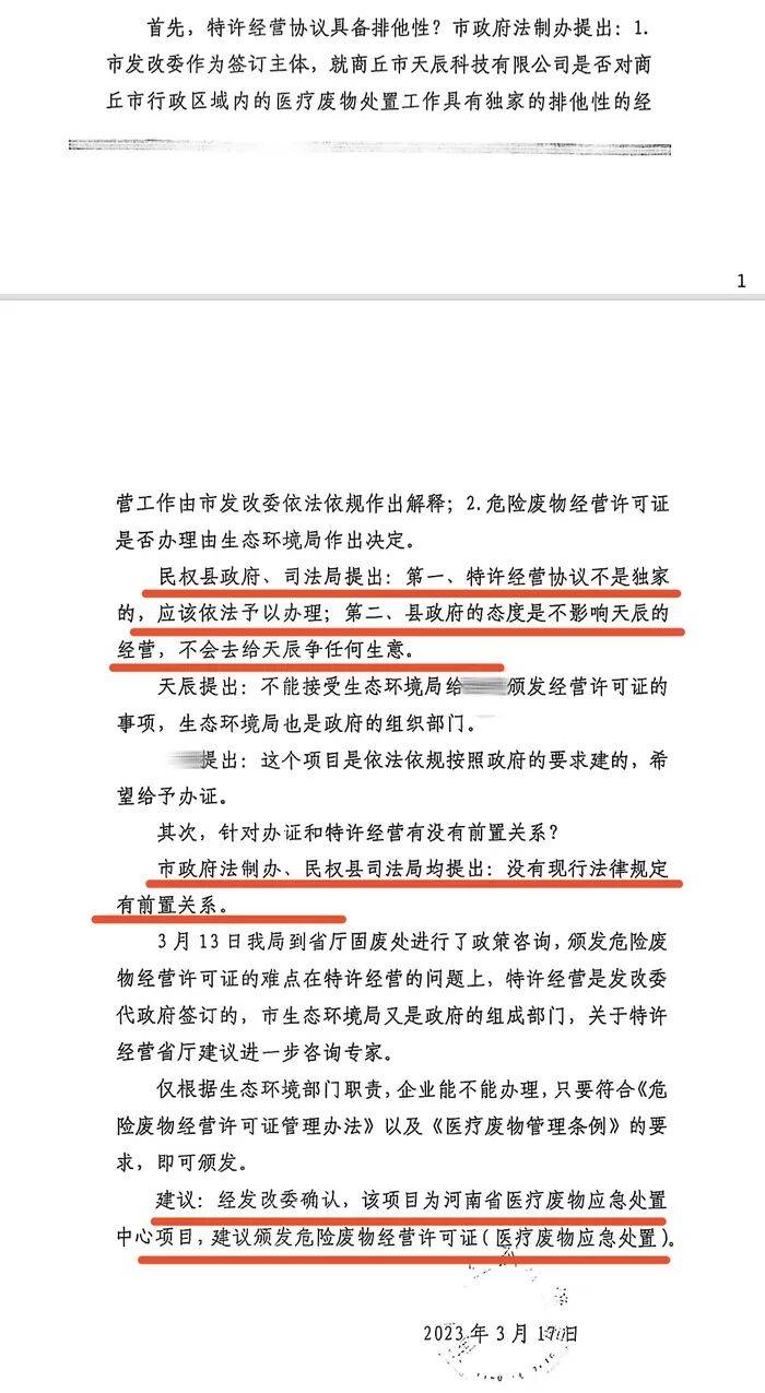2023年3月10日,为使民权县这家企业成功申领危险废弃物经营许可证,商丘市生态环境局还牵头组织商丘市政府相关科室、民权县政府、申证企业和天辰环保,对发展改革委代市政府与天辰环保签订的《特许经营权协议》和办证、特许经营有没有前置关系进行讨论。