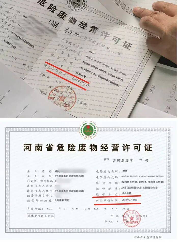 此外,林先生还质疑,2023年3月20日,民权这家企业申领《危险废物经营许可证》时,经营方式为“应急处置”,仅隔11天后,经营方式就更改为“综合经营”,“应急处置是解决突发性医疗废物的处置,综合经营是可以开展日常医疗废物处置业务。这两者之间区别很大,从流程上来讲,变更需要重新立项、做环评,短短11天根本不可能实现。”