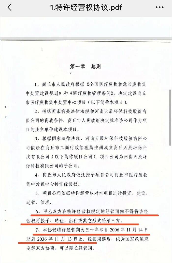 2023年,商丘市民权县一家企业成立了医疗废物应急处置中心,商丘市生态环境局给该中心颁发编号商环许可危废字02号《危险废物经营许可证》。这一变化,与商丘市发展改革委和天辰环保签署的《特许经营权协议》产生直接冲突。