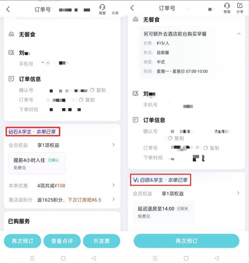 从刘同学提供的携程及去哪儿网平台的订单看,她的多笔酒店订单页面均标注“V2白银&学生・本单已享”“钻石&学生・本单已享”等字样。刘同学说,在她与携程的沟通中,平台称她在开通“拿去花”时已经签署了非在校学生的承诺函。