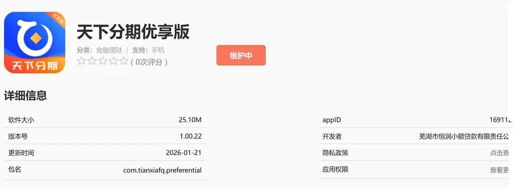 恒润小贷被监管通报:备案"天下分期优享版"等十余款借贷APP