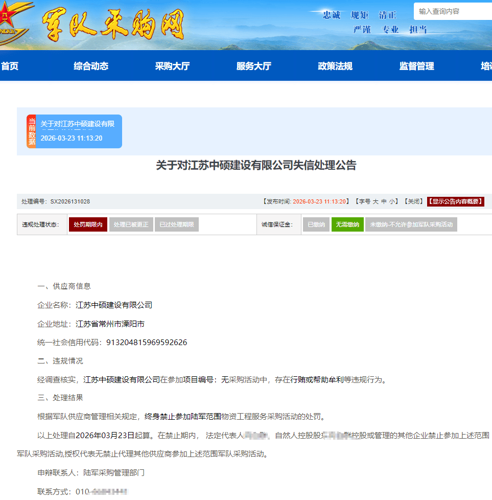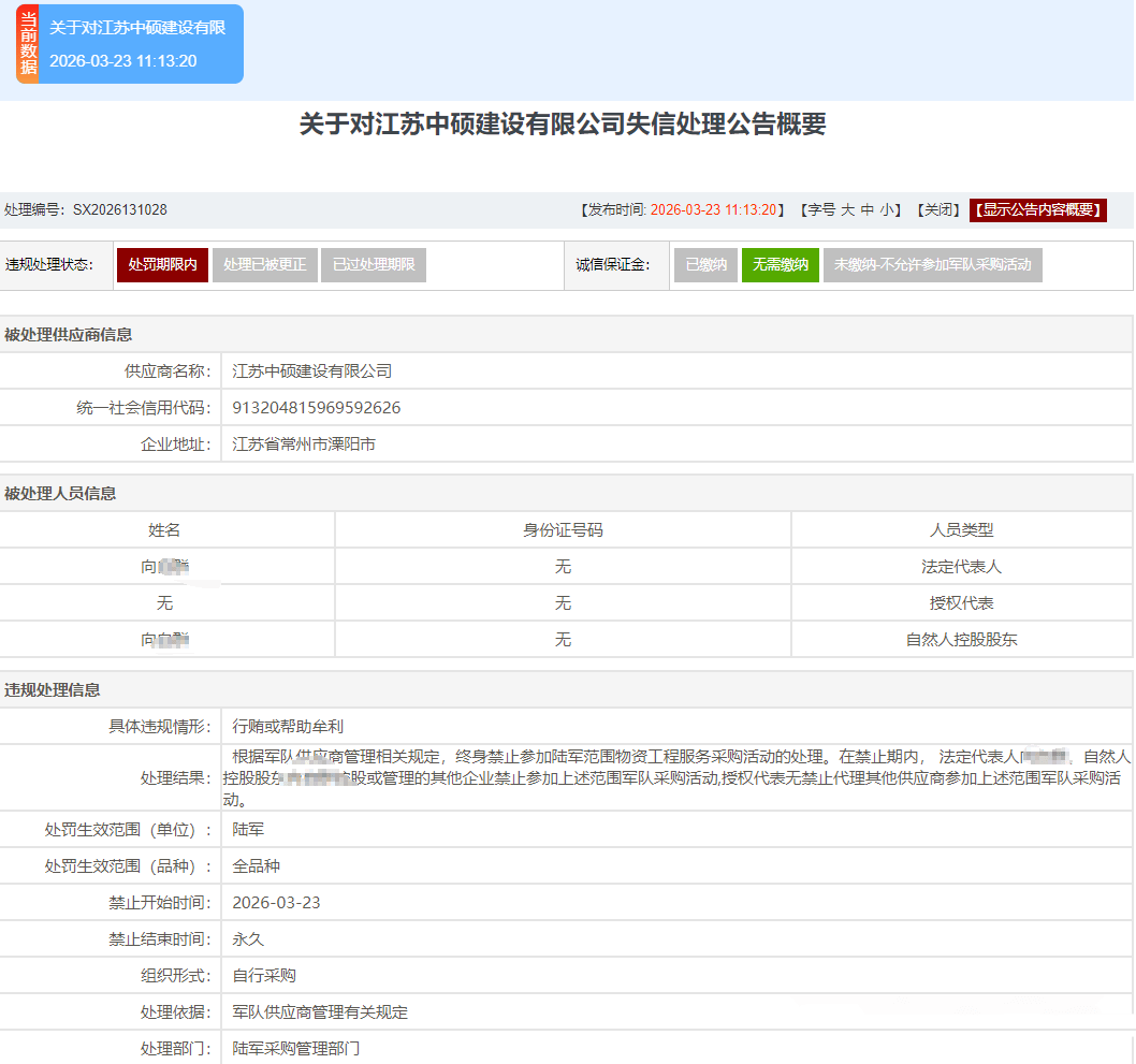 3月23日,军队采购网上发布“关于对江苏中硕建设有限公司失信处理公告概要”。