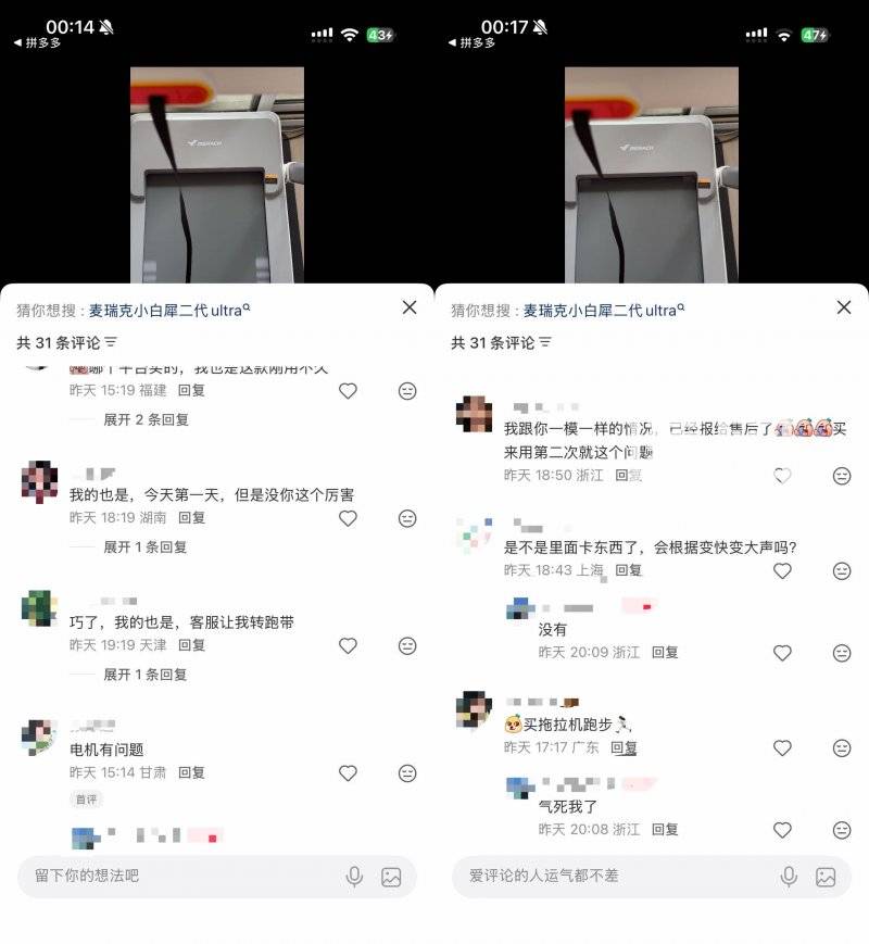 社交平台上,有网友发布了该款跑步机异响问题的视频,有网友形容机器运行时噪音轰鸣、震动强烈,如同拖拉机上路一般,也有网友自嘲是“买拖拉机跑步”。另有人表示,自己晚上根本不敢使用,生怕噪音过大被投诉扰民。