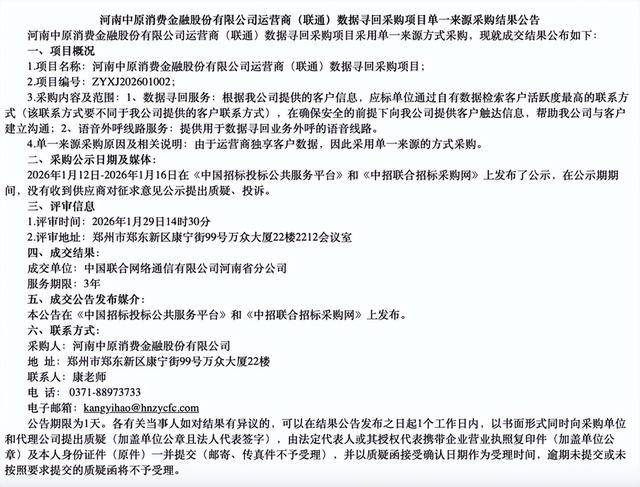 2026年一季度,中原消金相继完成了涵盖运营商数据寻回、短信通道、智能语音外呼、委外催收乃至异常维权打击等多个环节的大额招采。一条围绕“失联借款人”的立体贷后链条,逐渐从幕后走到台前。