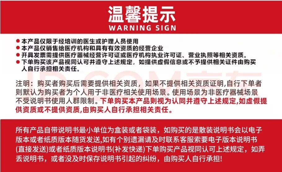 “京喜自营”显然也清楚,械三类水光针并不属于“可以由消费者个人自行使用的”医疗器械。在“京喜自营”的详情页中,其附上温馨提示称:“本产品仅限于经培训的医生或护理人员使用,本产品仅销售给医疗机构和具有有效资质的经营企业……购买者购买后需要提供相关资质。”