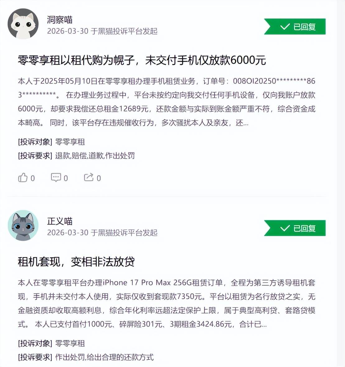 如今,在黑猫投诉上关于零零享租机的投诉量超3000个,大量涉及“套路贷”、“变相非法放贷”等问题。