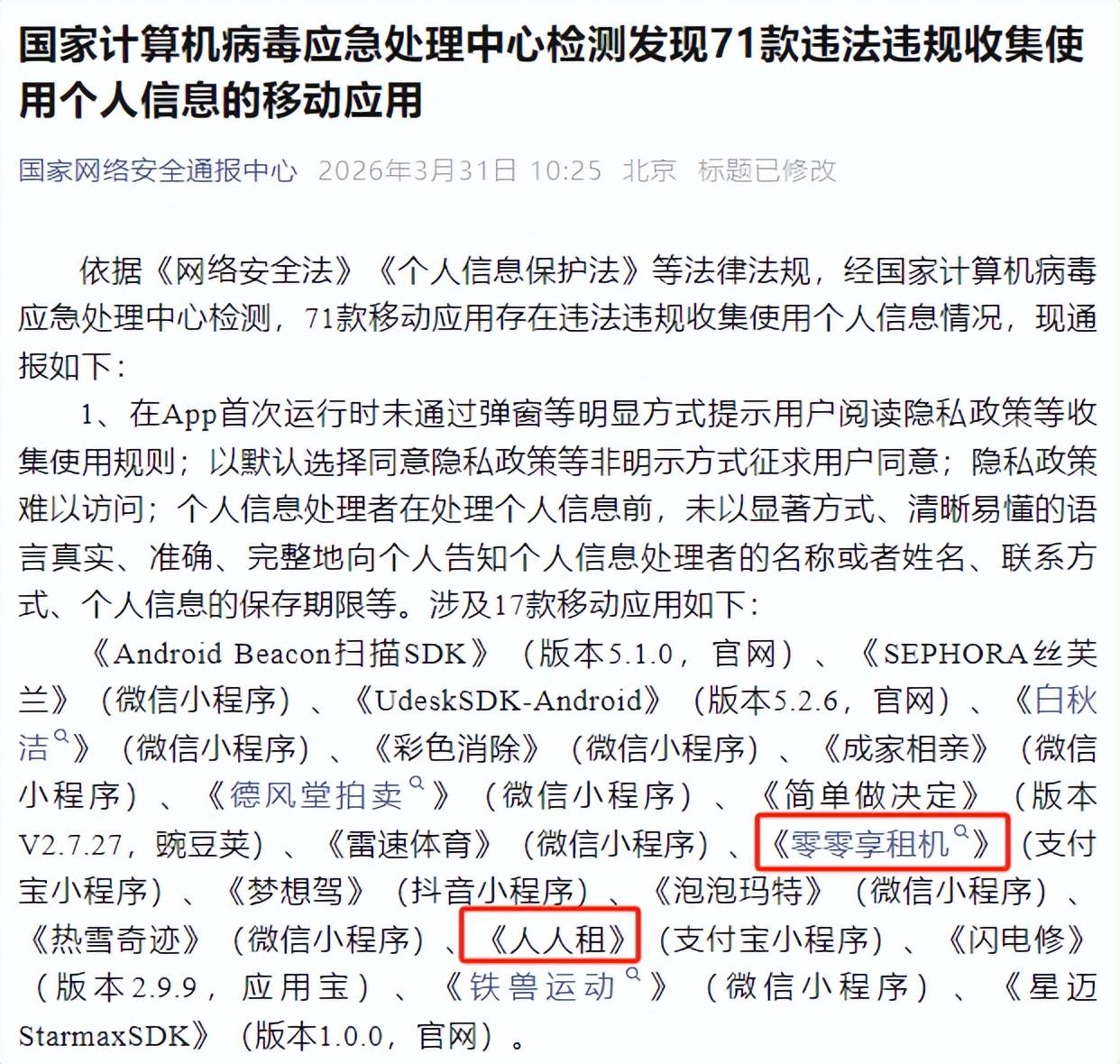 3月31日,国家网络安全通报中心发布消息,称依据《网络安全法》《个人信息保护法》等法律法规,经国家计算机病毒应急处理中心检测,71款移动应用存在违法违规收集使用个人信息情况。