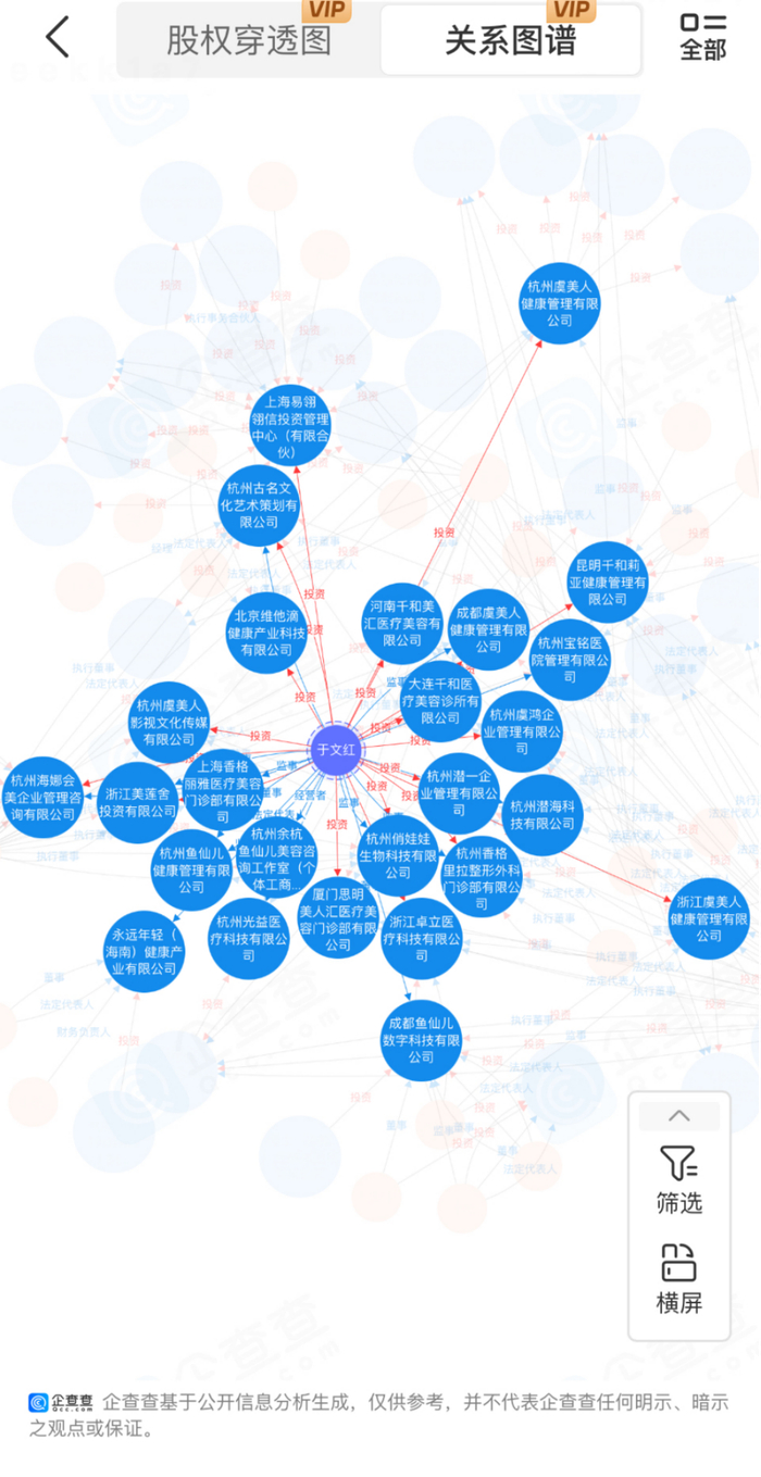 企查查数据显示,目前于文红个人关联企业多达47家,其中21家已注销或被吊销;即便如此,如今虞美人仍在杭州、成都、广州、深圳等全国多城布局30家线下诊所。