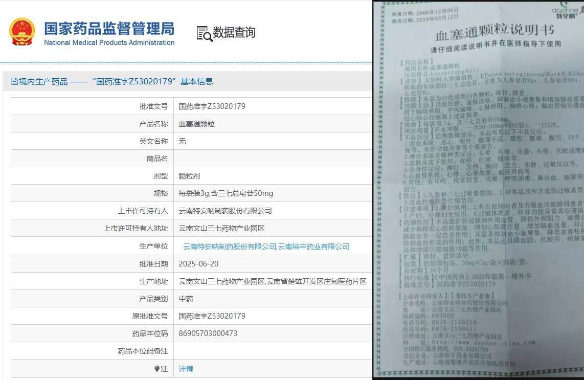 除股权风险外,特安呐制药核心产品血塞通颗粒(国药准字Z53020179)的市场乱象,再次敲响药品合规宣传的警钟。根据国家药品监督管理局核准的产品说明书,该药品为处方药,核心成分为三七总皂苷,法定适应症仅为“活血祛瘀,通脉活络,用于脑络瘀阻,中风偏瘫,心脉瘀阻,胸痹心痛;脑梗塞、冠心病心绞痛见上述证候者”,同时明确标注孕妇慎用,哺乳期妇女、儿童用药安全性尚无明确结论,存在恶心、呕吐、头晕、皮疹、血压波动等不良反应。