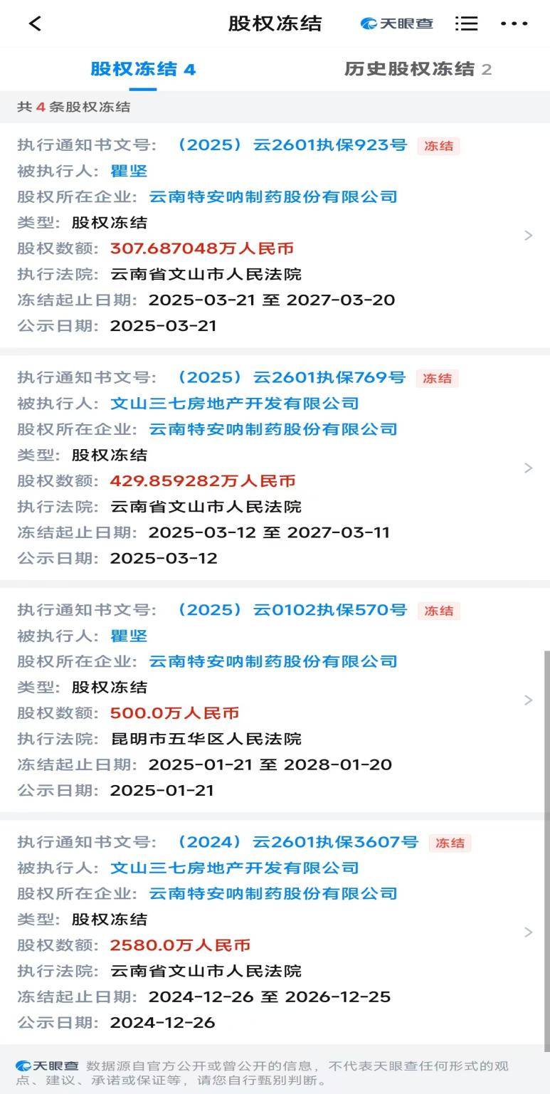 其中,持股28.997%的股东文山三七房地产开发有限公司,两次被云南省文山市人民法院冻结股权,冻结金额分别为2580万元(2024年12月至2026年12月)、429.86万元(2025年3月至2027年3月),累计冻结超3009万元,占其持股比例超51.5%,股权处置权基本受限。