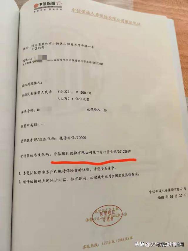 据郭女士介绍,其父母分别于2017年7月、2018年2月开始,每月在焦作中信银行存入500元。当时银行工作人员介绍,该行有一款强制储蓄、养老补充产品,每月存500元,连续存10年,到期利率高于同期银行存款,其间还附送保险。