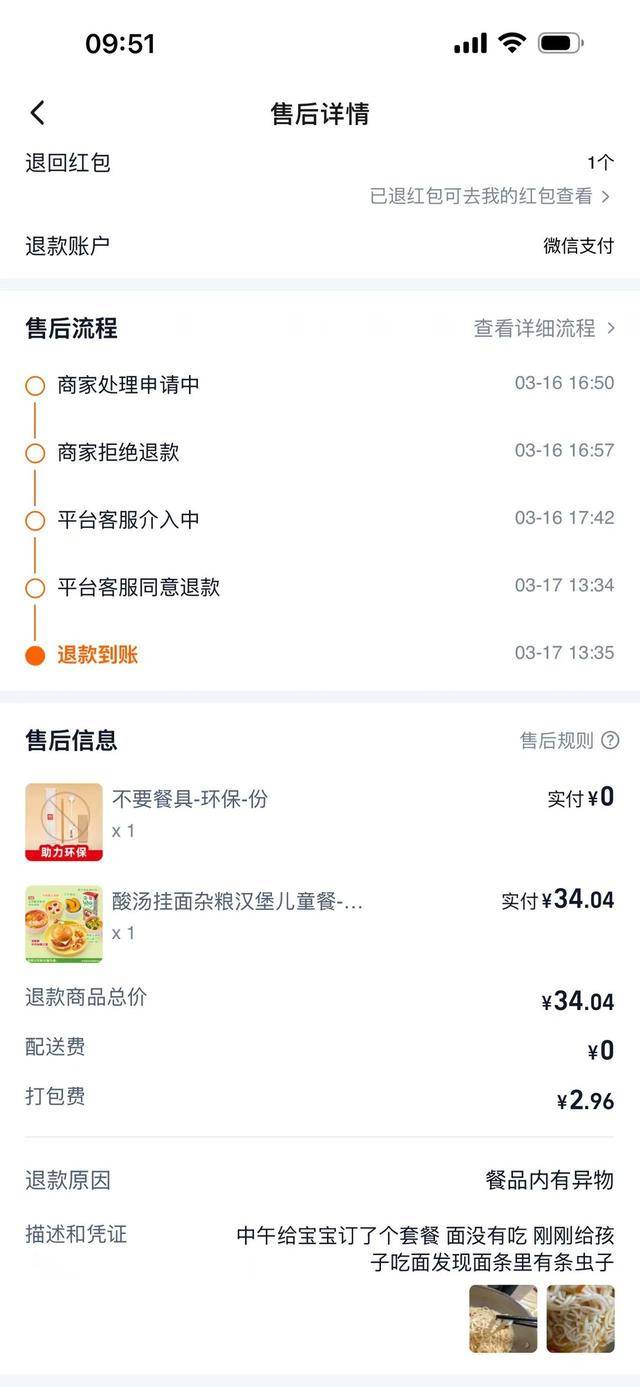 据汐汐女士介绍,当日她为孩子下单“酸汤挂面杂粮汉堡儿童餐”,孩子食用多口后,她翻拨碗底时竟发现一只完整的疑似蟑螂的异物。“孩子肠胃特别脆弱,看到这个情况我当时头皮发麻,恶心得直想吐。”她表示,事发后第一时间联系商家,对方起初拒绝退款,后经外卖平台介入,退还餐费共计37元,随后按食安险赔付148元。但汐汐女士认为,涉事食品为婴幼儿专用餐品,异物问题性质严重,再次向门店主张进一步赔偿,却遭拒绝,维权陷入僵局。