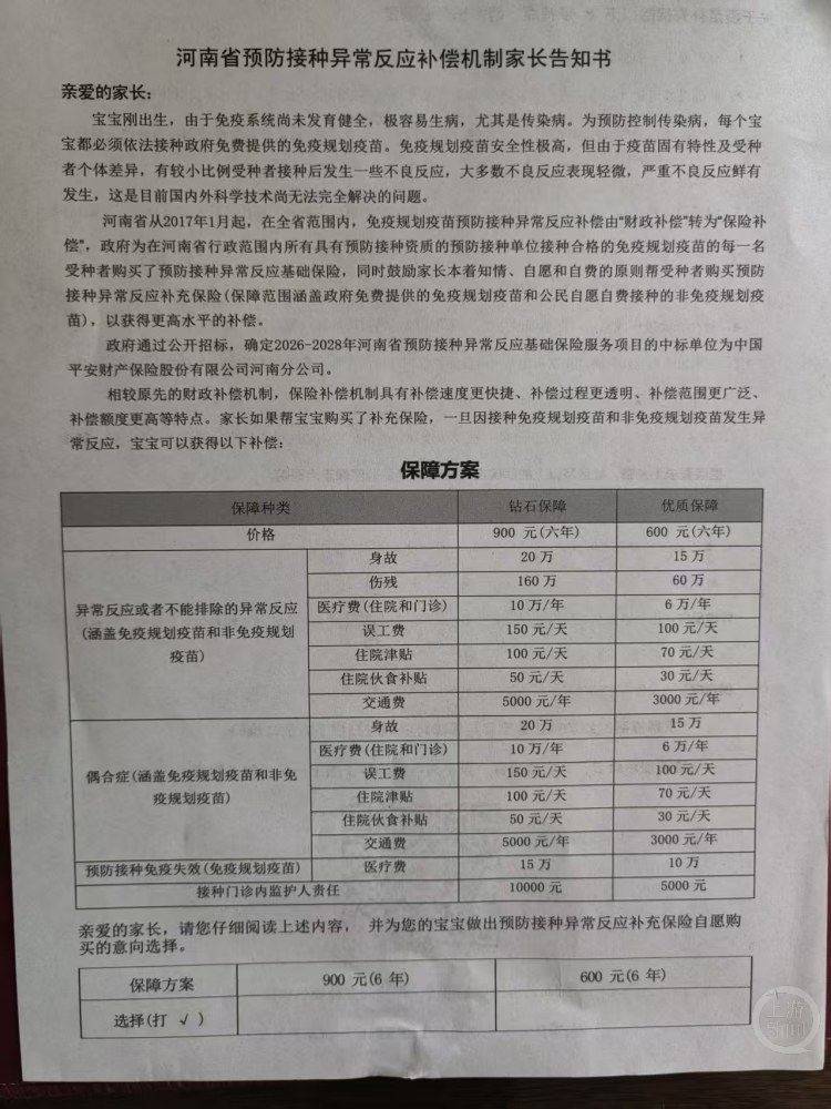 上游新闻记者走访了解到,近期不少河南带孩子接种疫苗的家长收到《河南省预防接种异常反应补偿机制家长告知书》。《告知书》显示,河南省自2017年1月起为每名受种者购买异常反应补偿基础保险,同时鼓励家长在知情、自愿、自费前提下购买补充保险,补偿水平更高,相关产品价格分为900元(6年期)、600元(6年期)两类,告知书所留咨询电话为平安财险客服热线。