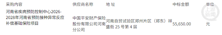 2月10日,河南省公共资源交易中心发布该保险项目中标公告显示,本次采购旨在保障全省免疫规划工作开展,提升免疫规划疫苗预防接种异常反应补偿效率与水平,采购内容为预防接种异常反应补偿基础保险服务,项目年度预算金额及最高限价均为144万元,中标单位为平安财险河南分公司,中标金额为5.565万元。