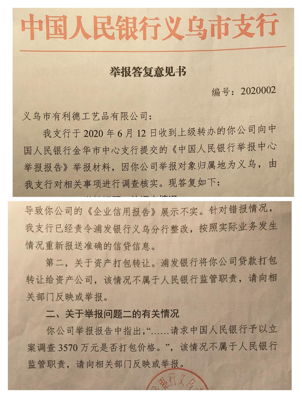 2024年12月30日下午,记者来到上海浦发银行义乌分行找到了行长郜峰。就义乌市有利德公司和虞红阳反映的问题,郜峰行长表示不接受采访。12月31日上午,记者来到上海浦发银行杭州分行,该行一位叫言莺的接待人员收下材料后表示,会向领导汇报后做出答复。随后,记者虽多次联系言莺,但截止记者发稿前上海浦发银行义乌分行和杭州分行均未对此事给予回复。