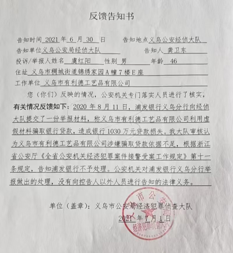 得到答复是:浦发银行义乌分行向“金融信用信息基础数据库”报送你公司的信贷信息与实际不符,导致你公司《企业信用报告》展示不实,责令浦发银行义务分行整改。最后具体如何处理我们不得而知。上海浦发银行义乌分行不但伪造我们贷款记录,还恶意向公安机关报警,称有利德公司骗贷,公安机关查清事实后不予受理。”