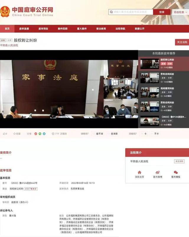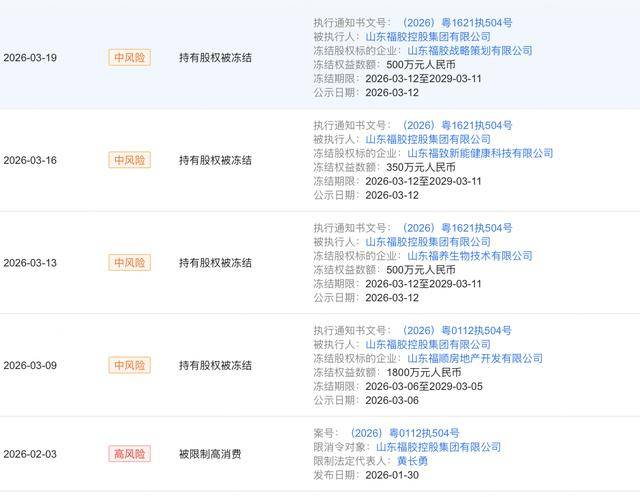 企查查信息显示,3月19日,山东福胶战略策划有限公司股权遭到司法冻结,冻结权益数额为500万元,冻结日期自2026年3月12日至2029年3月11日;3月16日,山东福致新能健康科技有限公司股权被司法冻结,冻结权益数额为350万元;3月13日,山东福胶控股集团有限公司(下称“福胶集团”)全资控股的山东福养生物技术有限公司的全部股权数额也被司法冻结。