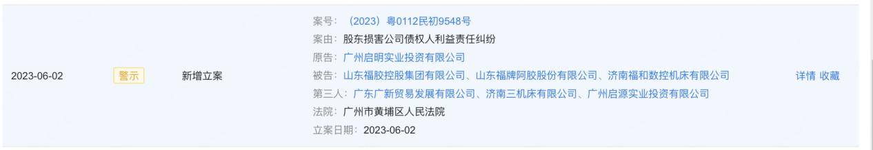 而从公开信息来看,福胶集团曾在2023年6月份被广州启明实业投资有限公司以“股东损害公司债权人利益责任纠纷”为由起诉到广州市黄浦区人民法院,除了福胶集团外,一同被起诉的还有山东福牌阿胶股份有限公司和济南福和数控机床有限公司,福和数控机床公司同样是由杨福安实际控制的企业。