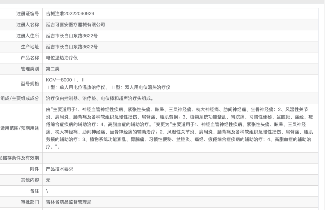 ▲国家药品监督管理局官网,可喜安电位温热治疗仪的医疗器械注册证信息显示,该产品对某些疾病具有辅助治疗的作用。网页截图