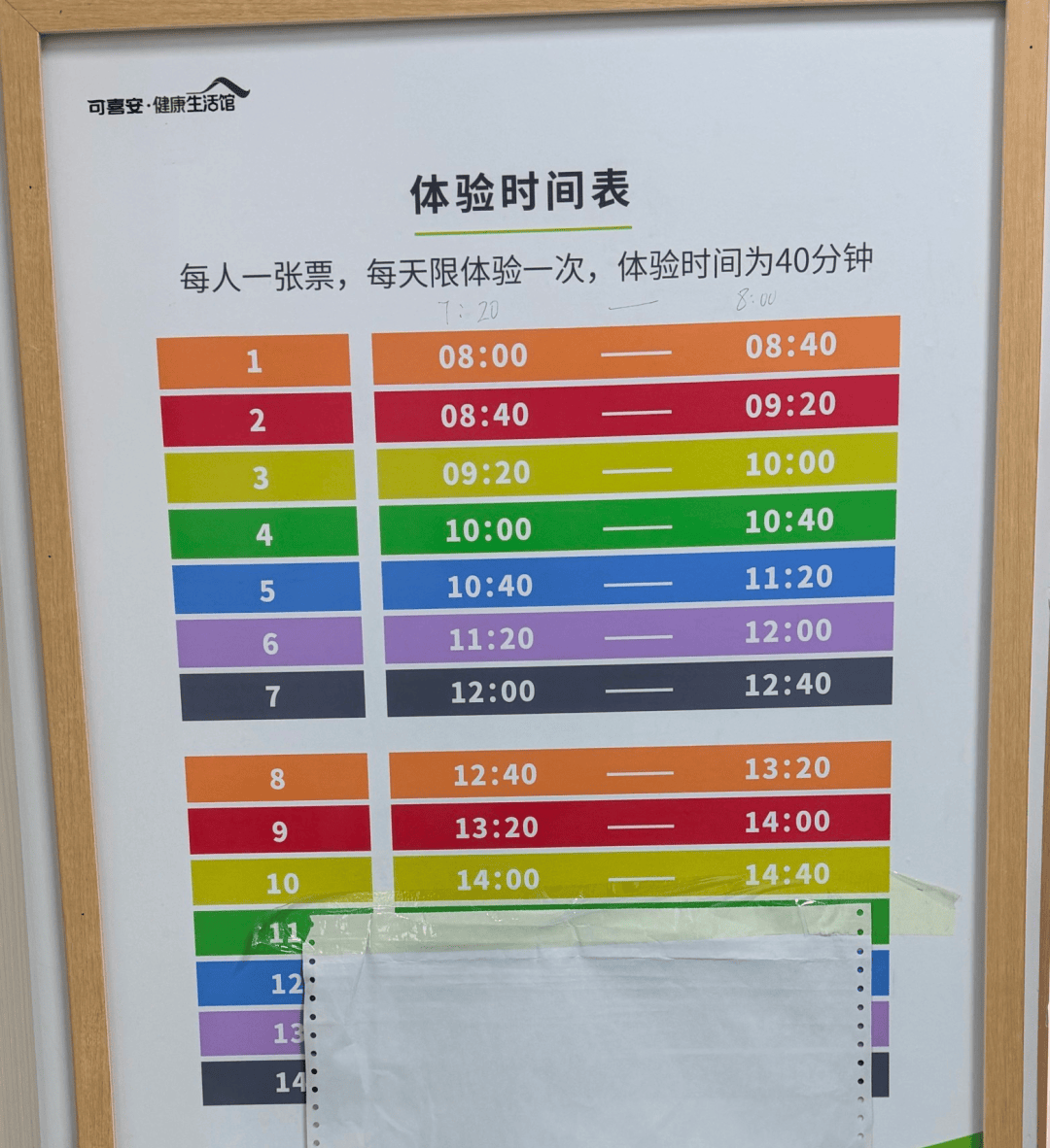▲可喜安门店内贴有体验时间表,每天大约10节,从早上8点持续到下午3点左右。 新京报记者 丛之翔摄