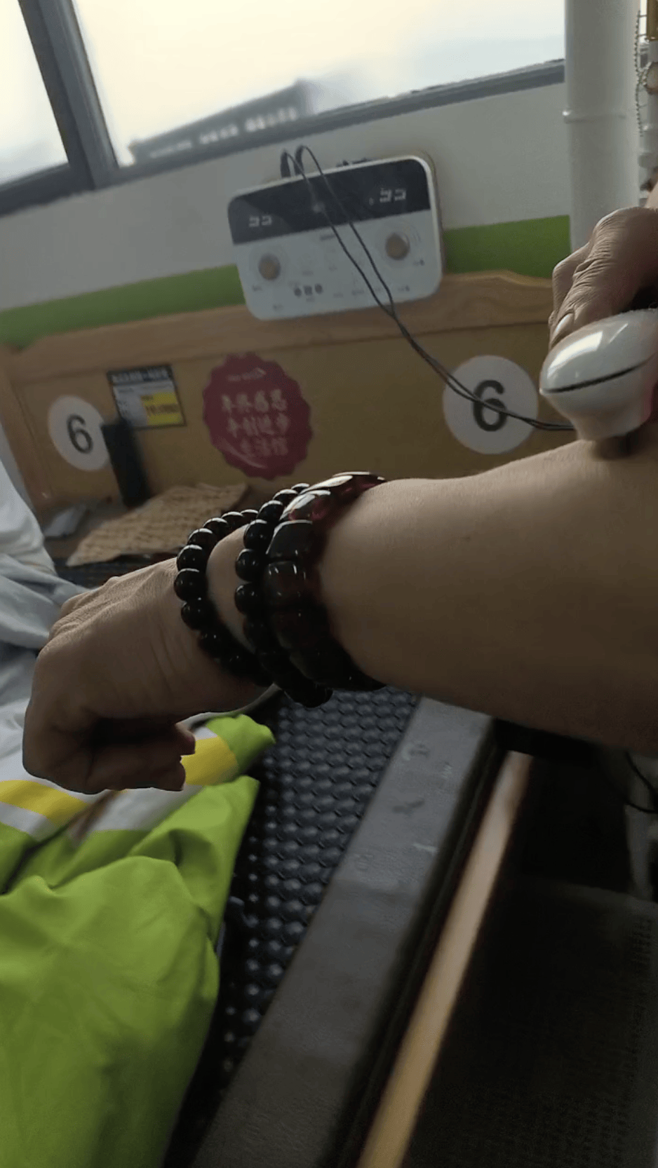 每次到店,老师都会热情地接待,“您来了。”帮体验者找床位,每过几分钟便询问温度是否合适。等体验结束,老师还会用棒状仪器,逐一为体验者做治疗。