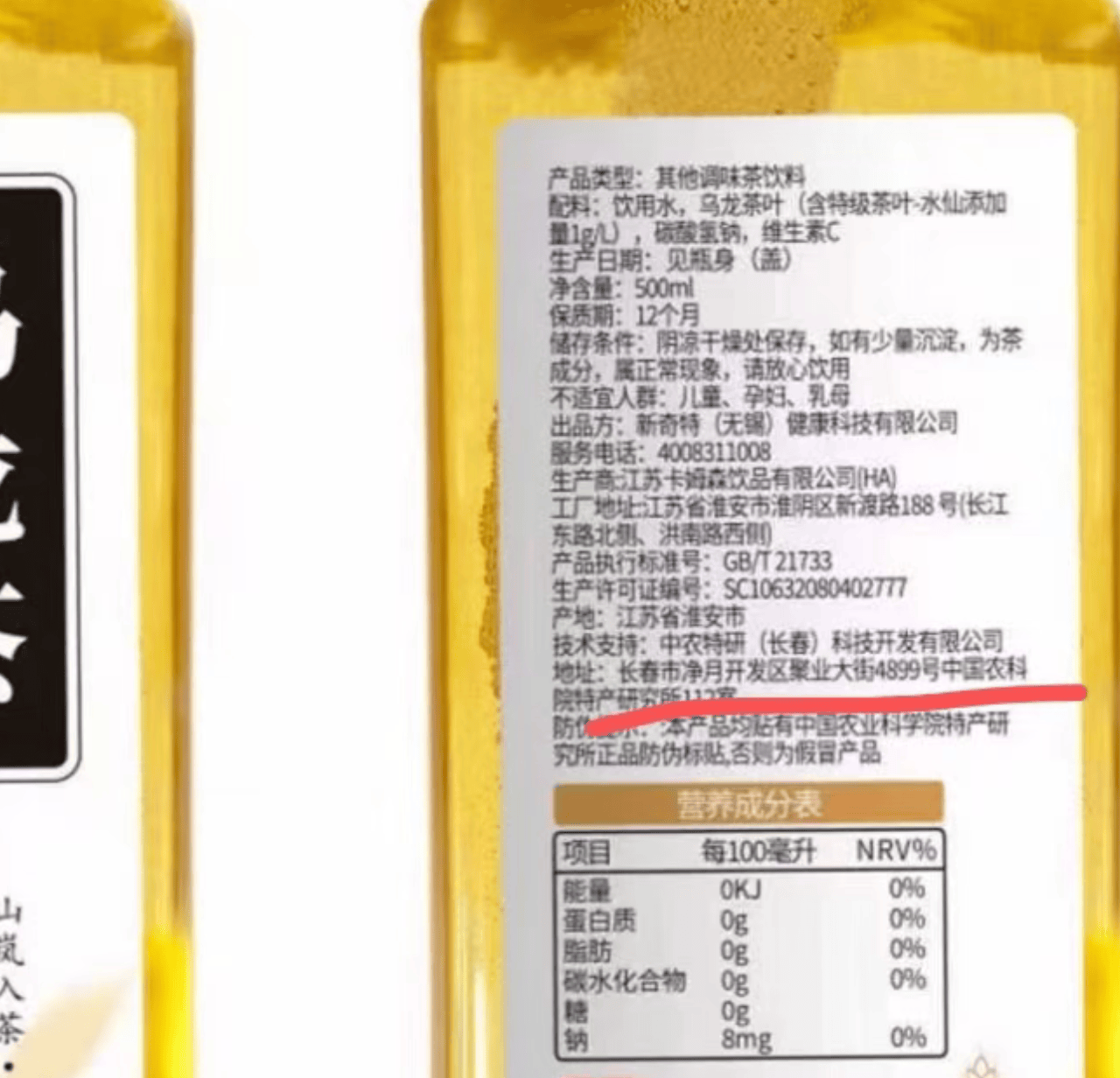 记者在瓶身上找到了生产商“江苏卡姆森饮品有限公司”的信息,却并未看到“中国农业科学院特产研究所”生产的相关标注。