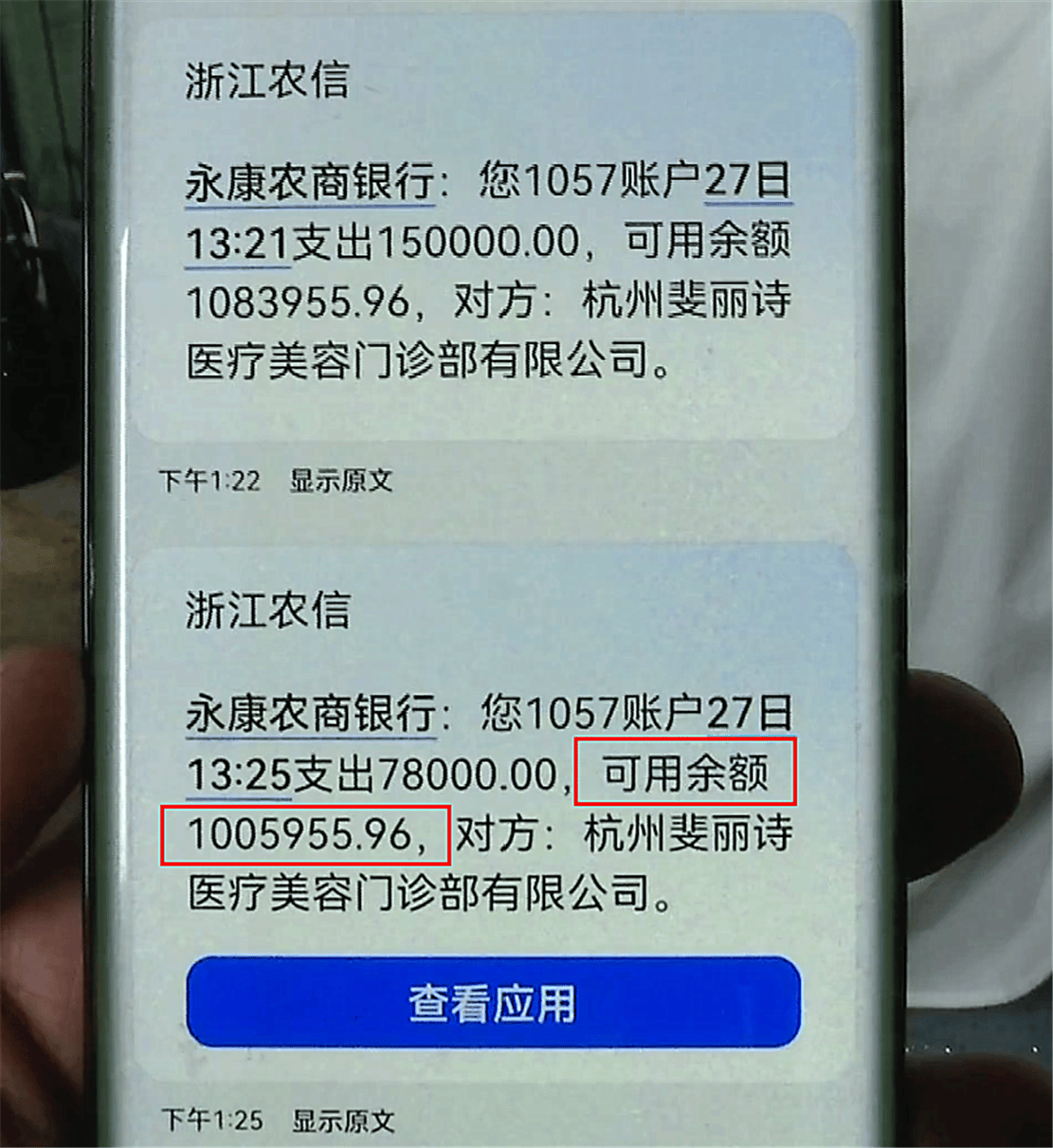银行扣款短信显示:2025年4月27日,雷大姐向“杭州斐丽诗医疗美容门诊部有限公司”分三笔转账,合计27.8万元。同年5月和7月,她再次到该机构“复诊”,又分别支付了51.6万元和39.78万元。三次累计达119.18万元。