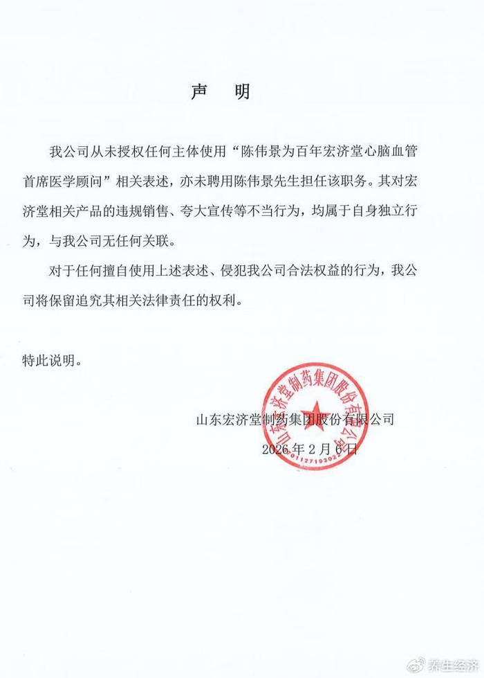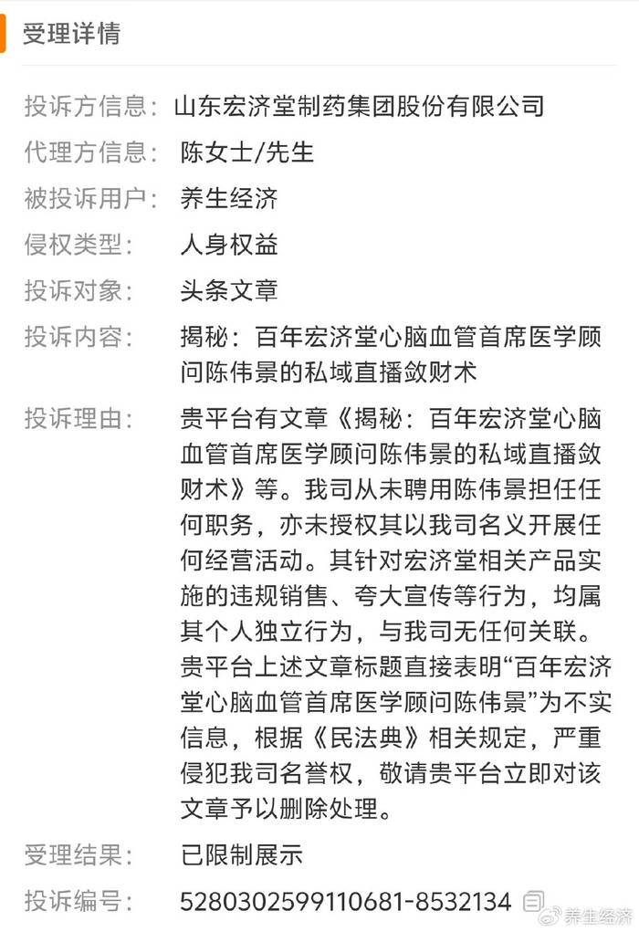 2026年2月6日,在相关曝光内容引发关注后,宏济堂发布声明,明确表态从未授权任何主体使用“陈伟景为百年宏济堂心脑血管首席医学顾问”的表述,也未聘用陈伟景担任该职务,称其违规销售、夸大宣传行为均属个人行为,与公司无关。声明发布后,宏济堂迅速向相关平台发起投诉,以“未经允许公开带有公司印章的声明文件,严重侵犯公司隐私权和商誉权”为由,要求下架曝光陈伟景私域直播敛财的相关内容,最终该曝光内容被平台限制展示。