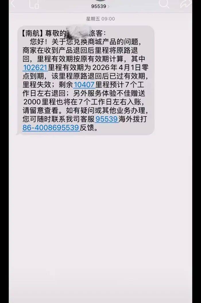 在退货过程中,由于前期沟通反复、处理周期延长,其账户内部分里程于4月1日到期。4月3日,当事人收到南航方面通知,称“退回里程已过期作废”。